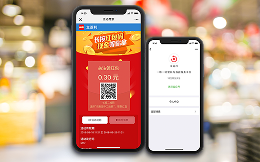 消费者扫码后关注微信公众号领奖,粉丝快速增长,并结合红包、积分、优惠券、抽大奖、 云秒杀等几十种玩法,实现公众号内粉丝的激活-留存-复购,令号内运营收益最大化